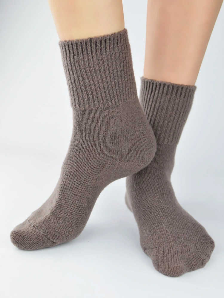 Dámske hrubé ponožky vyrobené z mäkkého úpletu s vlnou, veľmi príjemné na dotyk, vhodné na chladné jesenné a zimné dni. Poskytujú teplo a pohodlie pri nosení, majú široký lem, ktorý netlačí.