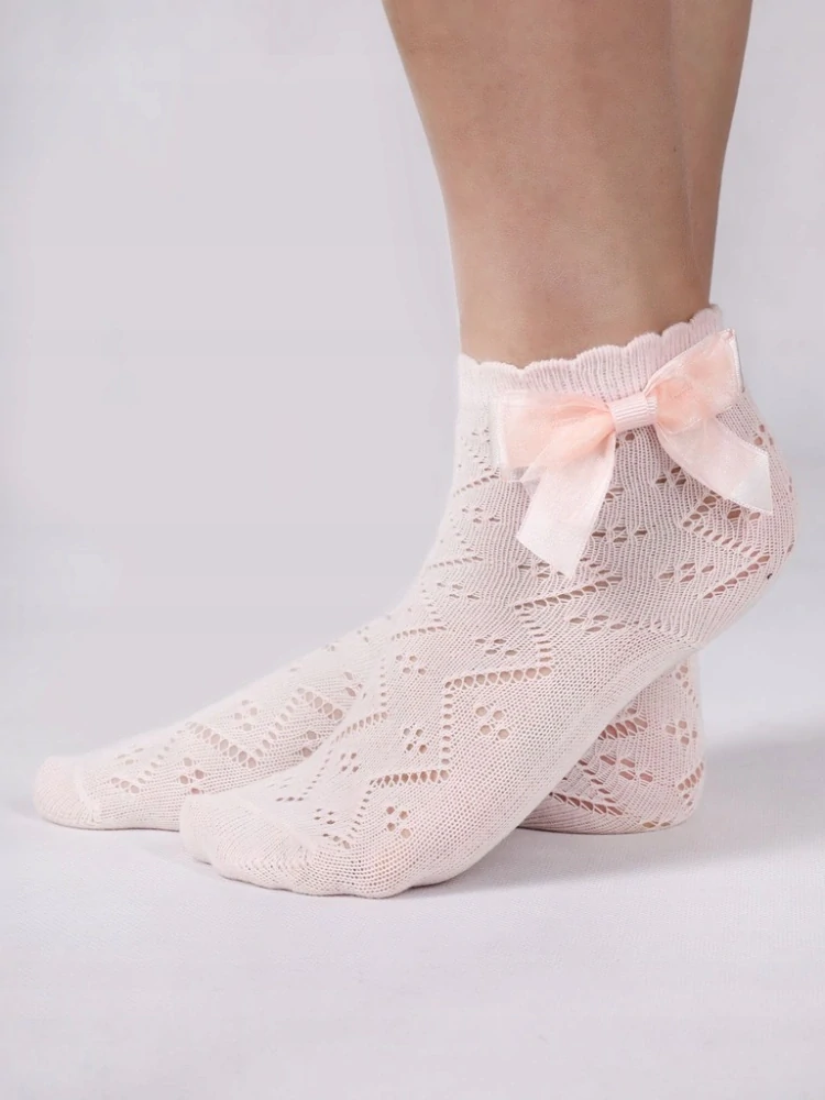 Detské ažurové ponožky s mašličkou. Jemný vzor ponožkám dodáva elegantný charakter a mašľa dievčenský nádych. Perfektne sedia na nohe. Ideálne do balerínok a inej ľahkej obuvi, ktoré dodajú outfitu elegantný a dievčenský nádych. Vhodné na každodenné nosenie.