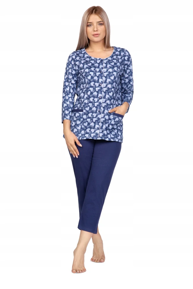 Dámske pyžamo z jemnej bavlny, klasického strihu. Vrch je zdobený srdiečkovým motívom, zapínanie je vpredu na gombíky s dvomi prednými vreckami a 3/4 rukávom. Nohavice sú 7/8 dĺžky.