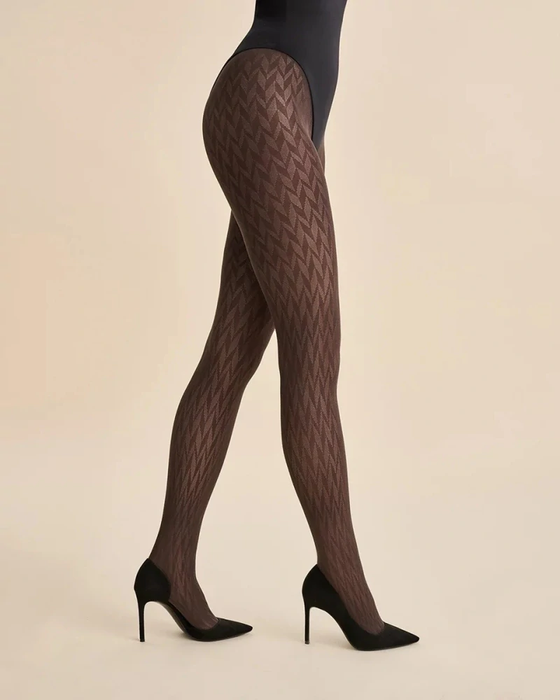Pančuchové nohavice Reyna majú výrazný vzor rybej kosti. Geometrický vzor opticky zoštíhľuje nohy.